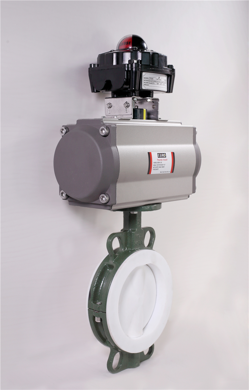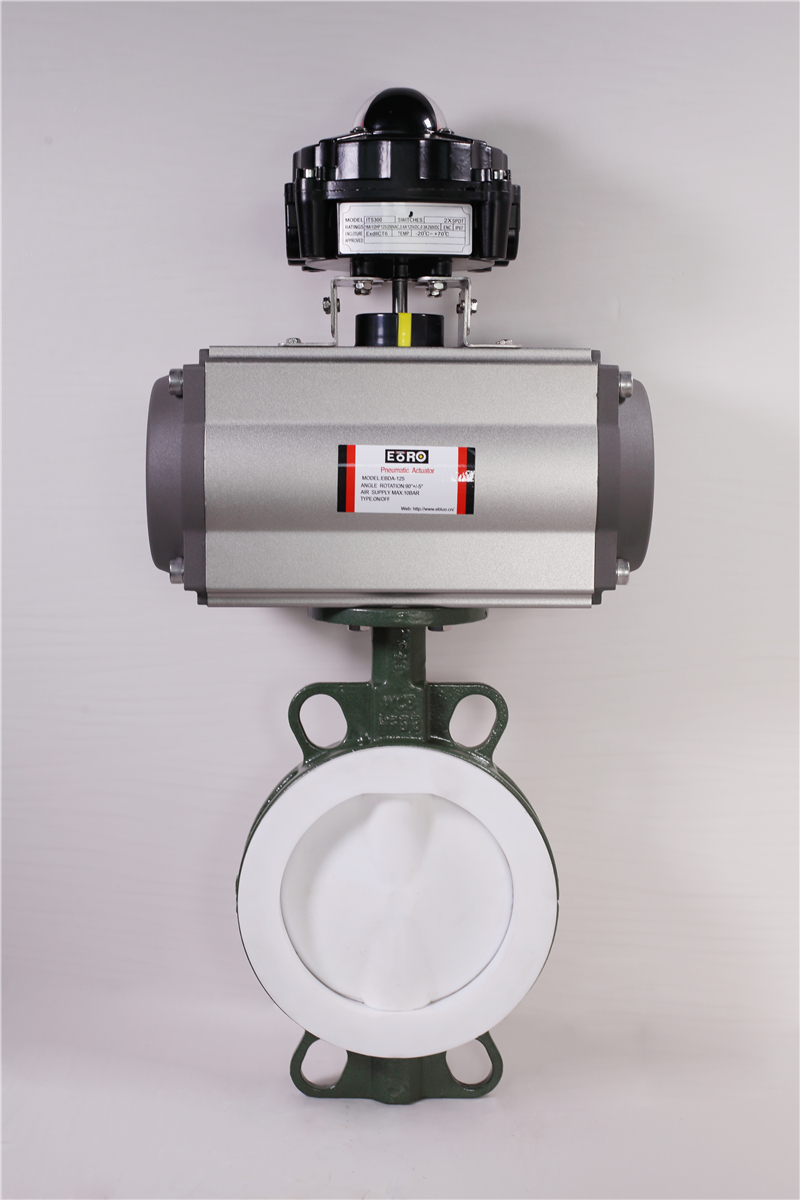 軼博羅襯氟氣動蝶閥采用帶有球形密封表面的襯聚四氟乙烯包襯蝶板,襯氟氣動蝶閥操作輕便,嚴密的密封性能,超長的使用壽命;可作快速切斷或調節流量之用。襯氟氣動蝶閥適用于要求可靠密封和良好調節特性的場合。閥體采用分體式,閥軸兩端的密封由蝶板與閥座 之間的旋轉基面加氟橡膠來控制;保證閥軸不與腔內流體介質接觸。廣泛適用于各種不同類型工業管道中液體和氣體(包括蒸氣)的輸送,有嚴重腐蝕性介質的使用場合,如:硫酸、氫氟酸、磷酸、氯氣、強堿、王水等具有強腐蝕性的介質。